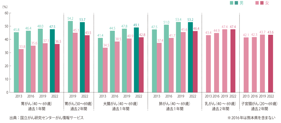 しかし、がん検診の受診率は低く、男性でもっとも受診率が高い胃がん検診(50~69歳)で53・7%、女性でもっとも受診率が高い乳がん検診で47・4%にとどまっています。