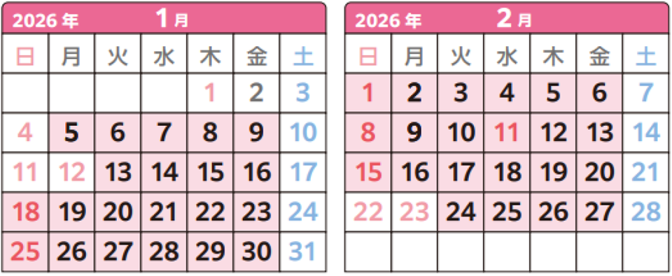 | 対象日 | 下記カレンダー内の色付されている日が対象です |