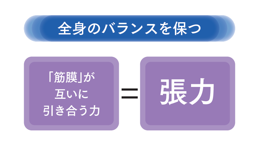 人体は206の骨と640の筋肉で構成されていますが、それらの筋肉のなかで連携して働く一団を「筋膜」という伸縮性のある組織で覆っています。人体はその筋膜が互いに引き合う力=張力によって全身のバランスを保っています。このような人体の構造を「テンセグリティ構造」といいます。