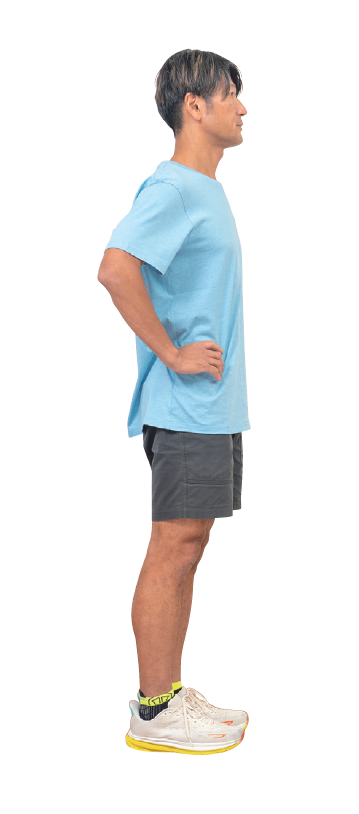 両足を閉じて、両手を腰に置く。