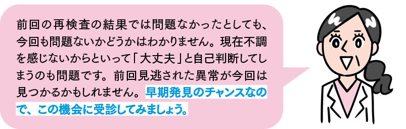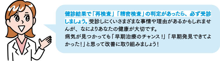 健診は受けっぱなしでは意味がありません。健診結果で、「再検査」や「精密検査」を受けるよう指示があった場合は、忘れずに受けましょう。